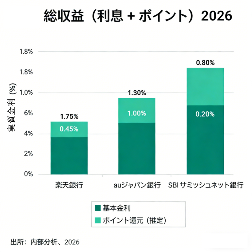 2026年の競争は、単なるデジタル利回りの域をはるかに超えています。「ポイントプログラムの統合」は、銀行が顧客獲得のための中核戦略となっています。楽天のエコシステムであるVポイントとauのPontaポイントマトリックスの統合により、ユーザーは銀行に預金しながら、ポイントで生活費を直接補填することができます。金利上昇の時代において、預金段階に応じたポイント還元は、公共料金の上昇圧力を相殺する効果も期待できます。2026年の最新統計によると、「獲得金利」と「ポイント還元」を合わせた「実質金利」は、一部の銀行では1.5%を超えることもあります。