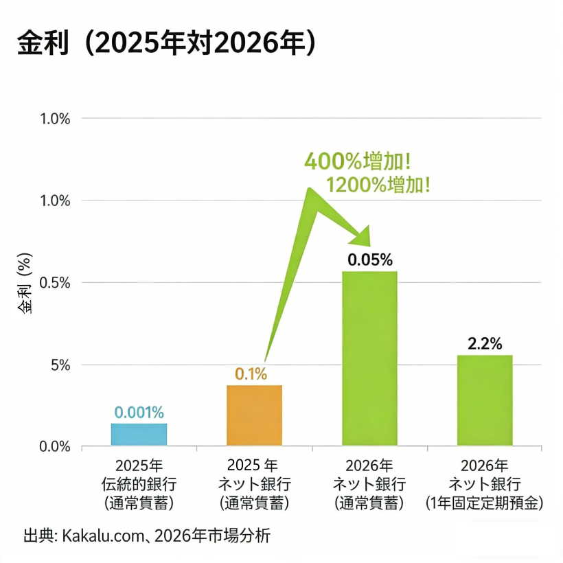 - 当座預金の「保証」価値:伝統的な3大銀行(三菱UFJ銀行、三井住友銀行、みずほ銀行)も金利を引き上げましたが、その対応はオンライン銀行よりもはるかに遅かったのです。オンライン銀行は、0.2%~0.5%の普通預金金利を提供することで、以前は紙の通帳に眠っていた大量の「休眠資金」を引き出すことに成功しました。