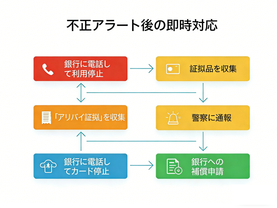 - ステップ2:「アリバイ」を用意する。これは見落とされがちな高度な証拠収集テクニックです。東京滞在中に大阪でカードが現金引き出しに使用されたことに気づいた場合は、すぐに近くのコンビニエンスストアで水を買うか、ATMで残高を確認し、紙のレシートを印刷して保管してください。このレシートは「カードが所有者の手にあり、所有者がそこにいなかった」ことを法的に証明し、補償請求の重要な証拠となります。