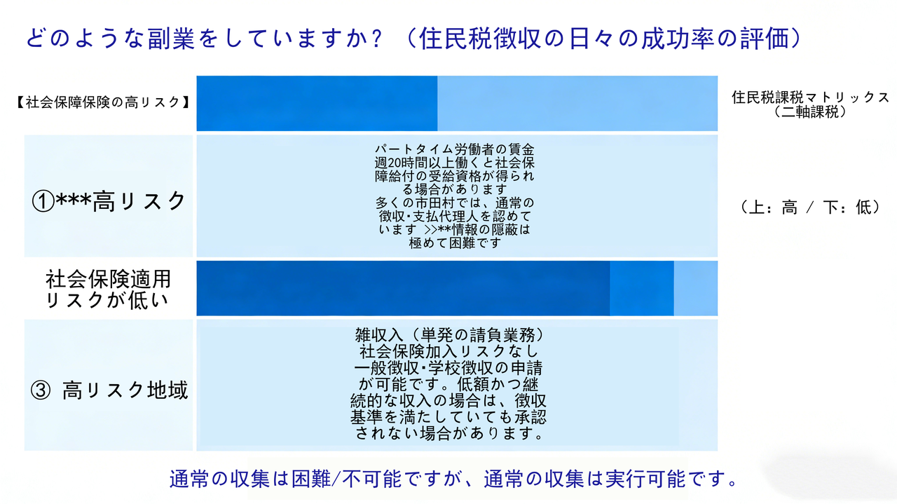 事業所得と雑所得の違い フリーランス(デザイン、ライティング、プログラミング等)としての活動は「事業所得」または「雑所得」に分類されます。この形態では、社会保険の強制加入が生じず、住民税を普通徴収に切り替えることによる情報隠蔽の成功率は非常に高くなります。